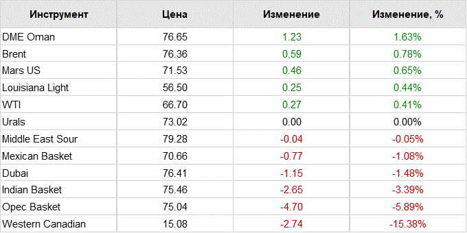 Цена декабрьских фьючерсов на Brent на лондонской бирже ICE Futures к 8:10 по Москве уменьшилась на $0,51 (0,66%) — до $76,38 за баррель.