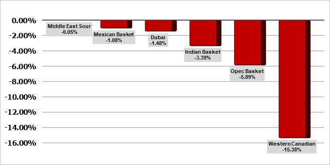 С начала недели Brent подешевела на 4,3%, WTI — на 3,4%.