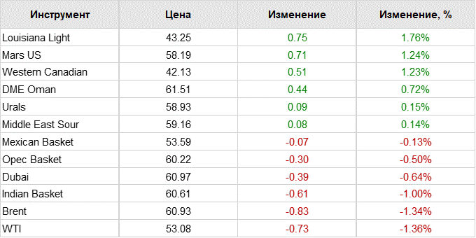 Стоимость фьючерса на WTI на март на электронной сессии на Нью-йоркской товарной бирже (NYMEX) понизилась к этому времени на $0,33 (0,61%) — до $53,36 за баррель. На предыдущих торгах WTI подорожала на $0,56 (1,05%), до $53,69 за баррель.