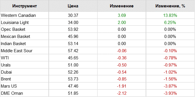 По итогам сессии в четверг котировка Brent упала на $2,31 (4,2%), до $52,16 за баррель, WTI — на $1,61 (3,5%), до $44,61 за баррель.