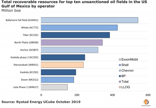 На рисунке 2 показаны общие извлекаемые ресурсы десяти крупнейших нефтяных месторождений Мексиканского залива, в отношении которых в ближайшие десять лет ожидается получение окончательного инвестиционного решения (ОИР). Крупнейшим новым проектом является ультраглубоководное месторождение Баллимор компании Chevron с запасами нефти более 500 млн баррелей. Одобрить его должны к концу 2021 года. Второе по величине ультраглубоководное месторождение, Whale, разработанное совместно компаниями Shell и Chevron, содержит около 400 млн баррелей нефти. Ожидается, что работа на нем будет разрешена уже в этом году. Открытый в 2009 году компанией Anadarko, Shenandoah является единственным проектом в этой области, который в настоящее время эксплуатируется разведочной компанией LLOG. В условиях истощения традиционных запасов нефти на суше, шельф становится как никогда важным. В целом, Rystad Energy высоко оценивает рост инвестиций в этот сектор. В долгосрочной перспективе он окажет положительное влияние на добычу и выручку компаний, занимающихся как разведкой и добычей, так и нефтепродуктами.