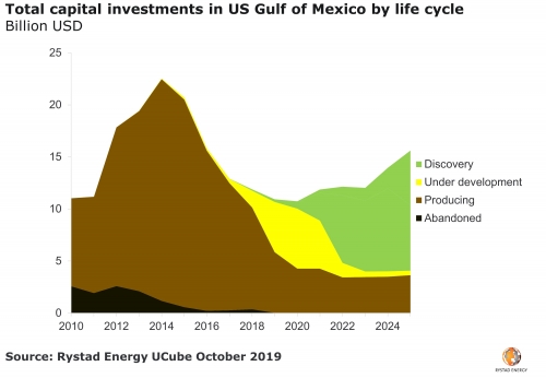 На диаграмме 3 показан общий объем капитальных вложений в Мексиканский залив с разбивкой по жизненному циклу проектов. Максимальный объем инвестиций в 2014 году составил 22,5 миллиарда долларов. Однако в течение следующих пяти лет объем инвестиций упал в два раза, до 11 млрд. долларов. Значительный вклад внесут недавние открытия глубоководных месторождений, включая Баллимор (2018) и Whale (2017), а также открытия, сделанные в 2014 году компаниями Anchor и Leon. Рост инвестиций после 2023 года будет обеспечен за счет введения в эксплуатацию месторождений Тибр (BP) и Дувр (Shell).