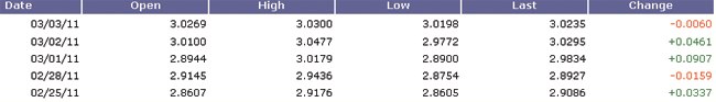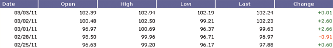 Цена на нефть по итогам торгов, состоявшихся на нью-йоркской товарной бирже, повысилась на $2,60 за баррель. Контракты на поставку черного золота в апреле заключались в конце рабочего дня по цене $102,23 за баррель.