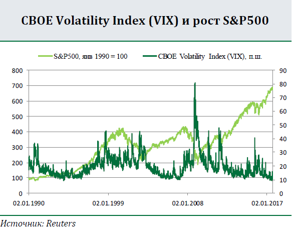 CBOE Volatility Index (VIX), отражающий волатильность индекса S&P500, находится на минимальных за много лет значениях. В период 2004-2006 гг., предшествующий ипотечному кризису в США, VIX составлял, в среднем, 14. В кризисный и посткризисный периоды VIX был значительно выше (до 81 в 2008 г.). С ноября 2016 г. по настоящее время (президентство Д. Трампа) – 12. Исторически снижение волатильности S&P500 часто соответствует росту рынка. Низкая волатильность может означать солидарность инвесторов в трактовке влияющих на рынок событий. В случае шока такая солидарность может обернуться масштабным изменением индекса S&P500.