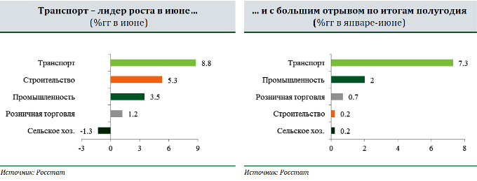 Доходы и потребительский спрос населения продолжают восстанавливаться. Реальные заработные платы устойчиво растут: +0,4%мм в июне. В годовом выражении рост замедлился с 3,7%гг до 2,9%гг за счёт эффекта базы. Основным драйвером роста по-прежнему остаётся частный сектор, особенно финансовые и сырьевые компании. Реальные доходы населения выросли на 0,5%мм, долгожданно выйдя из зоны отрицательного годового роста (0%гг). Розничная торговля третий месяц подряд растёт с минимальным темпом в 0,1%мм, достигнув в годовом выражении 1,2%гг.