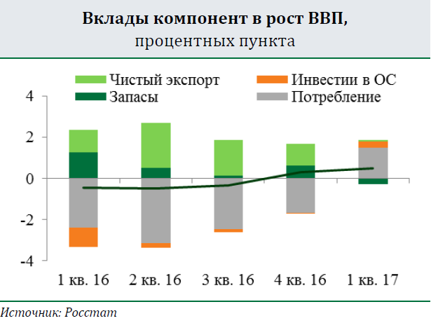 Основной вклад в рост ВВП в 1кв внесло потребление. Положительный вклад инвестиций полностью компенсирован сокращением запасов.