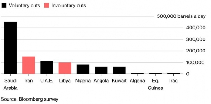 Крупнейший экспортер нефти — Саудовская Аравия — провел гораздо более глубокие сокращения, чем обещал. При этом ее ближайшие союзники — Объединенные Арабские Эмираты и Кувейт – также провели значительные сокращения. Эти преднамеренные ограничения усугубились непреднамеренным снижением объемов производства в Иране, против которого введены санкции США, и Ливии — обе страны были освобождены от соглашения группы.