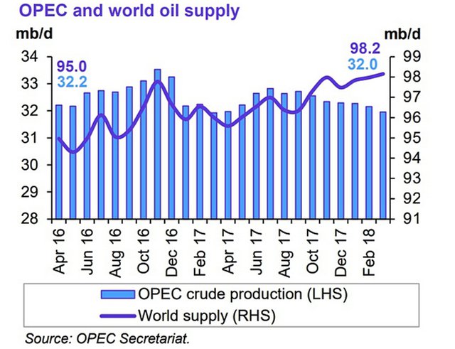 ОПЕК повысила прогноз роста поставок нефти из стран, не входящих в картель, на 80 тыс. б/с до 1,71 млн б/с в 2018 году. Во многом это обусловлено большим, чем ожидалось, ростом добычи в I квартале в США и странах бывшего Советского Союза.