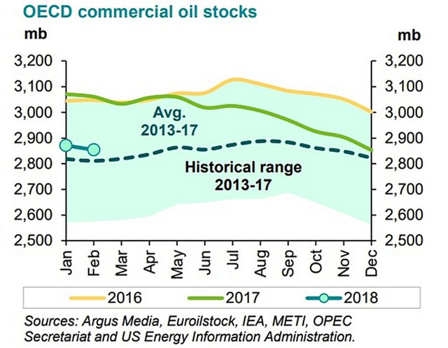 Уровень запасов на 207 млн баррелей ниже, чем годом ранее. Тем не менее запасы на 43 млн баррелей больше среднего показателя за последние пять лет, сообщается в отчете ОПЕК. С января 2017 года излишек запасов сократился на 294 млн баррелей.