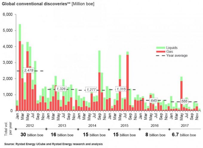 Исследователи в 2017 году обнаружили наименьшее количество нефти со времен 1940-х годов, по данным Rystad Energy, консалтинговой компании по нефти и газу.
