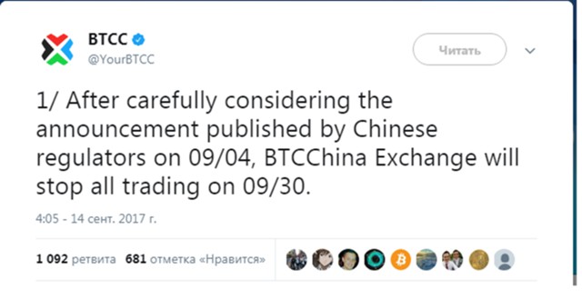 Обвал криптовалют продолжается. Вторая по величине криптовалютная биржа Китая BTC China подтвердила, что полностью остановит все торги на платформе начиная с 30 сентября. Началась ликвидационная паника.