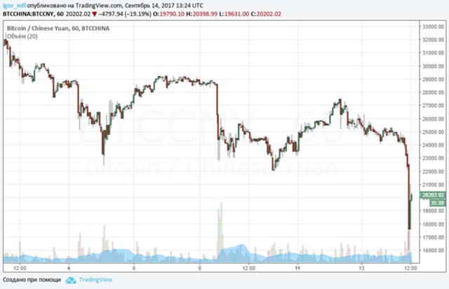 Реакция рынка не заставила себя ждать. Обвал биткоина, номинированного в китайских юанях, начался практически мгновенно.