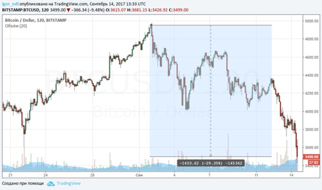 Впрочем, события в Китае сильно напугали участников рынка, и криптовалюты в долларах также находятся под серьезным давлением. Биткоин сегодня дешевеет почти на 10%. А падение от максимумов составляет уже 30%.