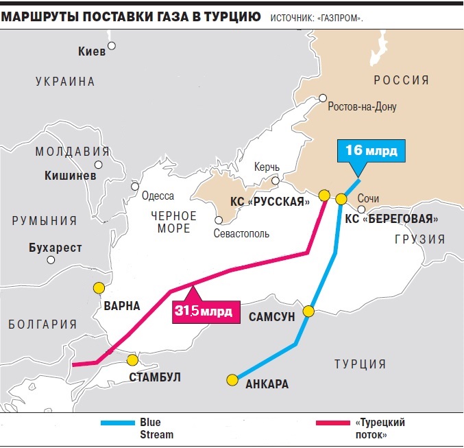 «Турецкий поток» представляет собой морской двухниточный газопровод из России в Турцию по дну Черного моря. Одна нитка мощностью 15,75 млрд куб. предназначена для потребностей Турции, а вторая — Балкан и Венгрии. Строительство в Болгарии и Сербии должно стартовать в 2020 году. В марте «Газпром» полностью завершил работу на линейной части газопровода через Черное море, соединив тем самым его морскую и прибрежную секции.