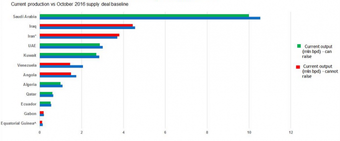 На нижеприведенном графике видно, кто из членов ОПЕК может, а кто не может увеличить объемы нефтедобычи