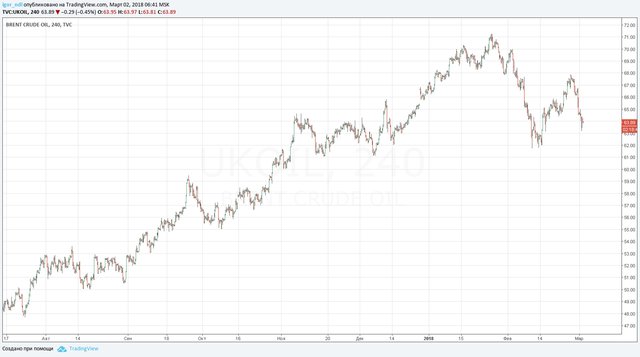 Так или иначе, сейчас успех картеля по сокращению добычи абсолютно не вдохновляет трейдеров. Баррель нефти продолжает снижаться. Сейчас стоимость североморской смеси опустилась уже ниже $64. К слову, цена российской нефти Urals выросла в январе-феврале на 24%.