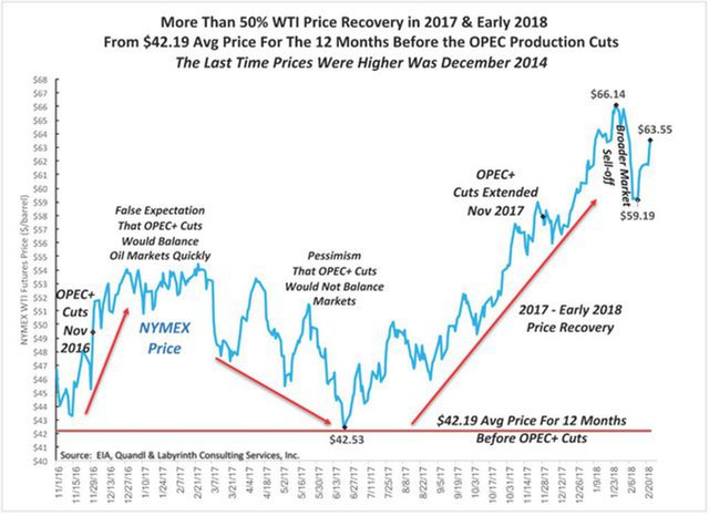 Цена WTI в среднем составила около $42 за баррель за 12 месяцев до начала производственных сокращений ОПЕК+ в ноябре 2016 г. Цены сразу выросли до более чем $50 на фоне ложных ожиданий быстрой перебалансировки нефтяных рынков. К марту 2017 г. возникла обеспокоенность по поводу того, что сокращения не дадут нужного эффекта, а к июню цены упадут до уровня, отмеченного до начала сокращений.