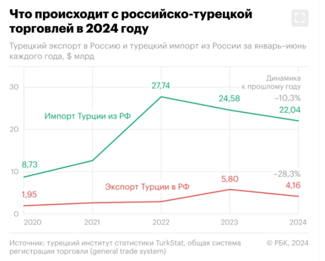 Согласно опубликованной 31 июля статистике турецкого статистического агентства TurkStat, экспорт товаров из Турции в Россию в первом полугодии 2024 года упал на 28,3% к тому же периоду 2023 года — до $4,16 млрд (против $5,8 млрд в первой половине прошлого года).