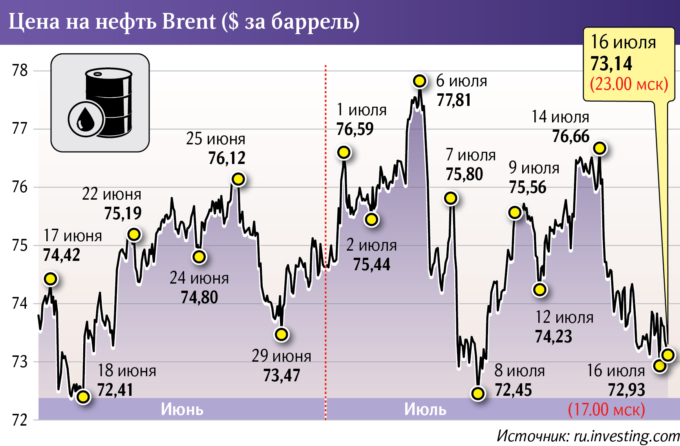 В ожидании решений ОПЕК+ нефтяные котировки показали снижение. В начале прошлой недели, 12 июля, сентябрьские фьючерсы Brent торговались на уровне $75,17 за баррель. 16 июля в 18:00 мск черное золото стоило уже $73,14 за бочку. Об этом свидетельствуют данные торгов лондонской биржи ICE.