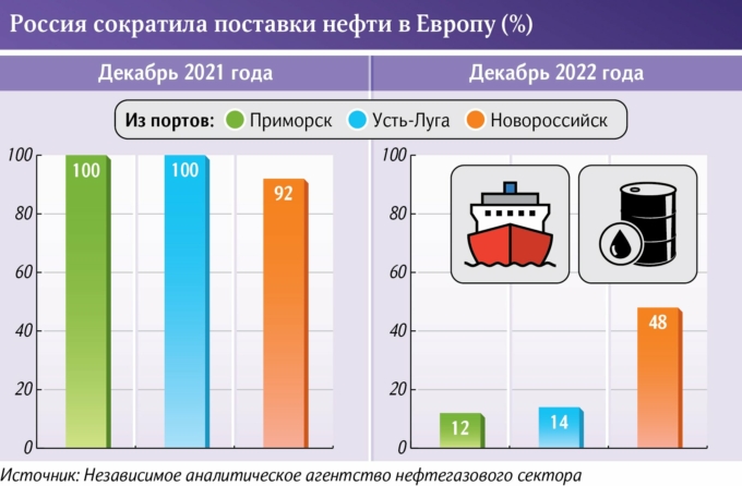 Россия перенаправила отгрузки нефти из крупнейших портов на Восток, следует из данных «Независимого аналитического агентства нефтегазового сектора», с которыми ознакомились «Известия». Так, если в декабре 2021 года из портов Приморск и Усть-Луга вся нефть направлялась в страны Европы, а из порта Новороссийск этот объем составлял 92%, то в декабре 2022-го отгрузки в недружественные страны Евросоюза из Приморска составили 12%, Усть-Луги — 14% и Новороссийска — 48%. Значительно вырос объем российских поставок в Турцию, Египет, Индию и Китай.