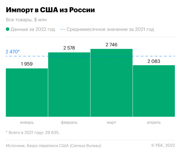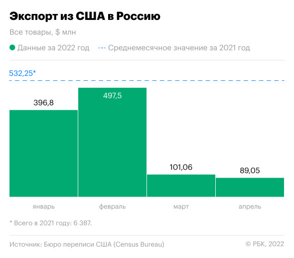 После падения американского экспорта товаров в Россию почти в пять раз в марте 2022 года по сравнению с февралем свежая статистика США за апрель показала дальнейшее схлопывание американо-российской торговли. Ввоз товаров из США в Россию в стоимостном выражении составил $89,1 млн против $101,1 млн в марте, что является новым минимумом за месяц по крайней мере с 2002 года. С этого времени есть ежемесячные данные Бюро переписей США (Census Bureau), до 2002-го — только годовые (но с начала 1990-х среднемесячный показатель стабильно превосходил показатель за минувший апрель).