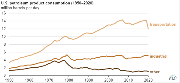 По данным EIA, в 2020 году в США потреблялось 18,1 миллиона баррелей нефтепродуктов в день, что является минимумом за 25 лет.