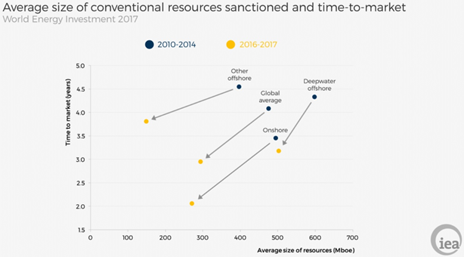 Некоторые компании, такие как Exxon Mobil и Chevron, перенаправили крупные акции своих капиталовложений в американский глинистый сланец, в то время как другие сделали ставку на глубоководную добычу. Тем не менее, общим для всех является тенденция ориентироваться на более мелкие проекты, которые окупаются в течение короткого периода времени. Это заметное изменение для отрасли, в которой традиционно доминируют длительные проекты с большим сроком выполнения.