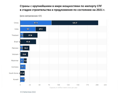 Что же касается ключевых потребителей СПГ, то Япония за прошедший год нарастила импорт СПГ лишь на 2% (до 104,3 млрд кубометров), а Китай — сразу на 16% (до 106,3 млрд кубометров), тем самым отобрав у Токио первое место в мире по закупкам СПГ. Наблюдался сильный прирост импорта у Южной Кореи — на 16%, до (63,8 млрд кубометров). Индия сократила импорт на 7% (до 31,8 млрд кубометров), но при этом все равно осталась в списке мировых лидеров по закупкам СПГ. То же самое можно сказать и про Европу — снижение импорта за 2021-й на 6% (примерно до 110 млрд кубометров).
