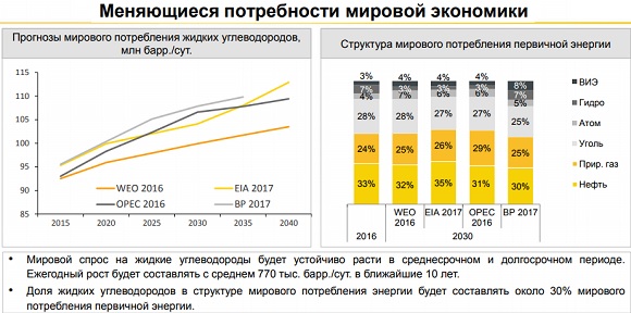Как следует из доклада И. Сечина, доля жидких углеводородов в структуре мирового потребления энергии в долгосрочной перспективе будет медленно снижаться, но по-прежнему останется достаточно высокой — около 30% мирового потребления первичной энергии, при увеличении их физических объемов. При этом некоторое снижение доли нефти в общем балансе будет практически полностью компенсировано ростом доли газа и удлинением производной нефтепродуктовой цепочки, прежде всего, за счет нефтехимического производства.