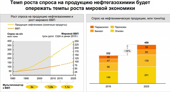 Так, 1м из наиболее перспективных направлений развития спроса на жидкие углеводороды сегодня и в ближайшем будущем будет нефтегазохимия. Ожидается, что к 2025-2030 гг прирост спроса на нефть со стороны нефтегазохимии превысит прирост спроса со стороны основного потребителя нефтепродуктов – транспортного сектора, — привел пример И. Сечин.
