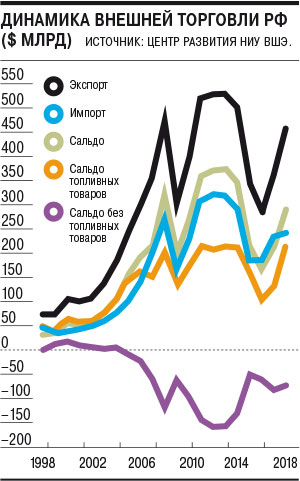 В торговле машинами и оборудованием (20,6% оборота) за пять лет показатель стал менее отрицательным (с минус 68,2 до минус 58,9 пункта) за счет падения импорта на 26,2% — но в сравнении с 1998 годом (тогда доля группы в обороте составляла минус 31,2%) зависимость от импорта увеличилась. За десять лет ослабли и позиции химпрома — и это несмотря на высокий экспорт удобрений и импортозамещение в производстве бытовой химии (суммарно по группе показатель с минус 4,3 пункта снизился до минус 22,8 пункта). Также быстрее экспорта рос ввоз текстиля и кожевенного сырья.