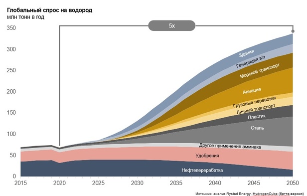 По прогнозам Rystad, заметный рост потребления водорода ожидается в 2030-е годы, к 2050 г. потребление вырастет в 5 раз: с текущего уровня в 70 млн тонн в год до почти 350 млн тонн в год. Основными источниками роста станут не текущие сектора потребления — нефтепереработка и химическая промышленность, — а новые сектора, прежде всего, в трех сферах — авиации и морском транспорте и производстве стали. Также к 2050 г. водород будет топливом для около 5% парка личных автомобилей и 10% дорожных перевозок, для генерации электроэнергии и тепла.