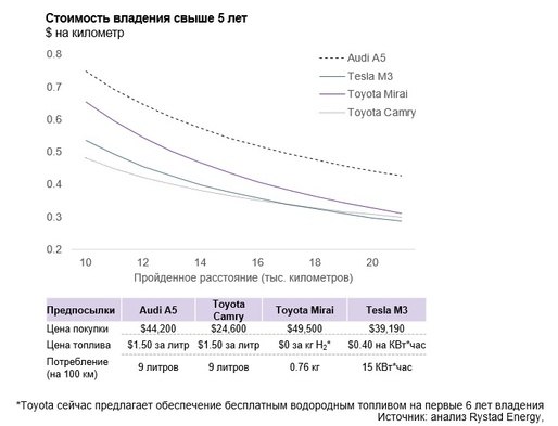 Стоимость владения автомобилем на водородных топливных элементах в сравнении с электромобилями и автомобилями с ДВС
