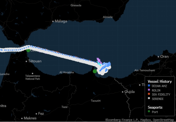 Танкеры, перевозящие флагманскую российскую нефть марки Urals, перегружают ее с меньших танкеров на большие вблизи города Надор на восточном побережье Марокко в Средиземном море, свидетельствуют данные отслеживания судов, собранные Bloomberg. С прошлого месяца военно-морские силы Греции проводят военно-морские учения в месте, где происходила эта торговля, в попытке сдержать ее.