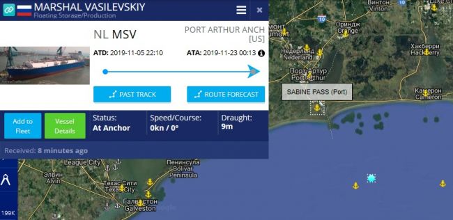 По данным навигационного портала Marinetraffic, плавучий регазификационный терминал «Маршал Василевский», который принадлежит «Газпрому», прибыл в Мексиканский залив и находится в режиме ожидания для подхода к терминалу СПГ Sabine Pass. Это первый и крупнейший в Соединенных Штатах завод по сжижению газа, чья мощность составляет сейчас 41 млрд кубометров в год. До американский миссии «Маршал Василевский» три месяца стоял у Роттердама в аренде у австрийской OMV, а первоначально использовался как часть альтернативного пути снабжения Калининграда газом. По данным агентства Reuters, газовоз «Газпрома» находится во фрахте у международного энергетического трейдера Gunvor и будет осуществлять доставку американского СПГ в страны ЕС.