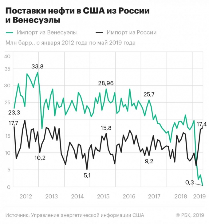 Объем импорта российской нефти в США за пять месяцев 2019 года подскочил почти в три раза по сравнению с аналогичным периодом прошлого года, следует из статистики американского Управления энергетической информации (EIA), изученной РБК. Это произошло на фоне американских санкций против Венесуэлы — в январе администрация Дональда Трампа ввела санкции против госкомпании PDVSA, а уже в августе — против правительства Венесуэлы.