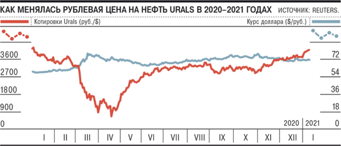По данным Reuters, 12 января рублевая стоимость российской нефти Urals достигала отметки 4,15 тыс. руб. за баррель — максимального значения с 8 января 2020 года. По итогам дня она осталась возле отметки 4,1 тыс. руб., прибавив за день 0,5%. Почти непрерывный подъем цен на нефть продолжается третий месяц подряд, и за это время она подорожала более чем на 40%. Только с начала года котировки выросли почти на 10%. В результате средняя цена Urals достигла 4 тыс. руб. за баррель, тогда как по итогам прошлого года составляла только 3 тыс. руб. за баррель.