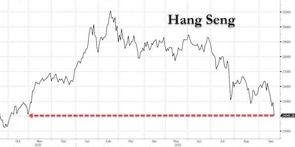 Индекс девелоперских компаний, торгующихся на офшорном китайском рынке, рухнул до 5-летнего минимума вслед за акциями Evergrande, стремительно летящими к нулю.