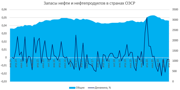 Среднемесячные запасы за 4 месяца 2021 г. снижались на 0,6% в месяц и составили 2984,8 млн баррелей (-112,5 млн баррелей г/г, +46,8 млн баррелей к среднему за 2015-2019 гг.), покрывая 67,7 дней потребления.