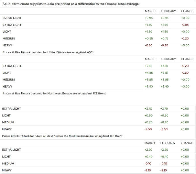 Мартовская цена оказалась ниже ожиданий рынка, который прогнозировал, что Саудовская Аравия повысит OSP примерно на 55 центов в связи с улучшением структуры рынка и опасениями перебоев в поставках на фоне эскалации конфликтов на Ближнем Востоке.