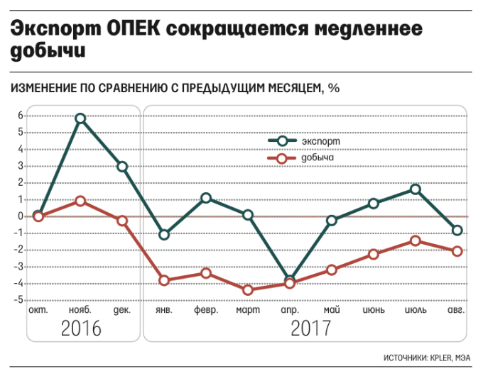 В соглашении о сокращении добычи за основу взят ее уровень в октябре 2016 г. С тех пор экспорт ОПЕК уменьшился на 213 000 баррелей в день, согласно Kpler, которая следит за передвижением нефтяных танкеров и другими поставками нефти в мире. Это примерно на 1 млн баррелей в день меньше обещанного картелем сокращения добычи. Сама же добыча ОПЕК, по данным Международного энергетического агентства (МЭА), к июлю снизилась примерно на 880 000 баррелей в день.