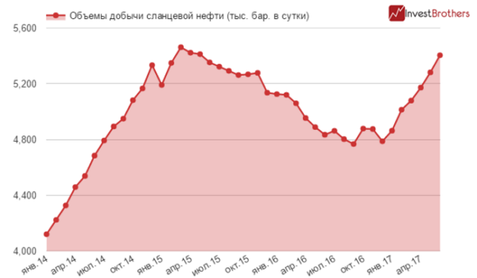 Таким образом, за первые полгода 2017 г. добыча сланцевой нефти может возрасти на 617 тыс. баррелей и, судя по темпу увеличения количества действующих нефтяных вышек, производители останавливаться пока не планируют.