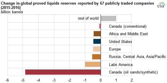 Дополнения от расширений и открытий и чистые покупки резервов у компаний, не включенных в этот анализ, были компенсированы значительными негативными изменениями в оценках существующих резервов компаний. Резервы также снизились, поскольку в 2016 году эти компании в общей сложности добывали 8,7 млрд. баррелей. Общим эффектом этих изменений и других факторов стало чистое сокращение подтвержденных запасов на 5,4 млрд. баррелей.