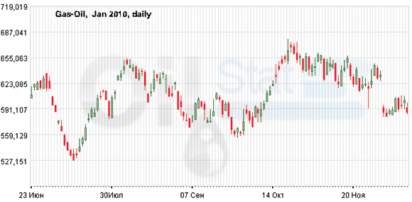 Стоимость январского контракта на газойль выросла на $24.25, или на 4.13%, и составила $611.00 за тонну.