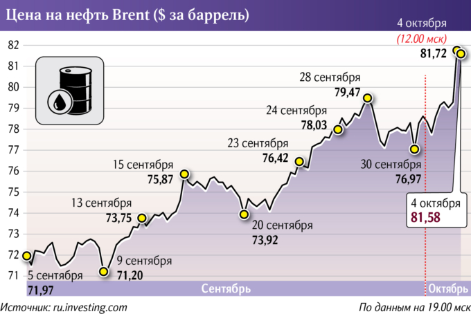 Накануне министерской встречи стран ОПЕК+ декабрьские фьючерсы показали позитивную динамику. В 10:00 мск 4 октября цена барреля Brent составляла около $78,8, в 15:20 мск она поднялась до $79,3, свидетельствуют данные торгов ICE. Уже после объявления решения картеля в 17:20 мск котировки превысили уровень в $81,5 за бочку.