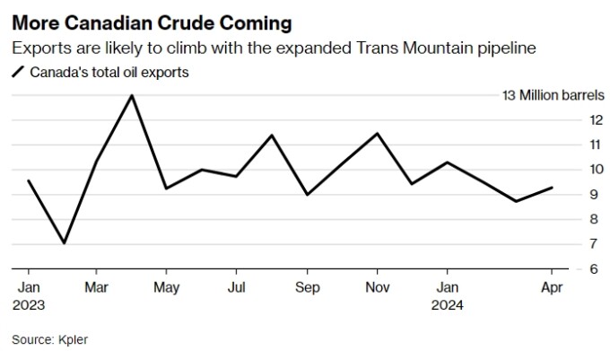Еще больше канадской нефти на подходе. Экспорт, вероятно, увеличится благодаря расширению трубопровода Trans Mountain. Источник: Kpler