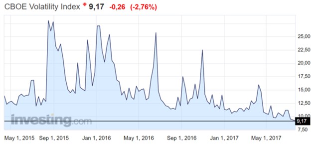 Индекс страха находился в диапазоне от 10 до 14 в течение первых трех месяцев 2017 г., и хотя затем он поднялся до 15,96, индекс застрял значительно ниже 14, а однодневное падение составило 26% девять дней тому назад. Ранее на этой неделе индекс закрылся на самом низком уровне с февраля 2007 г.
