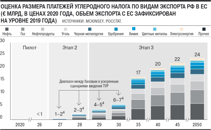 Впрочем, в КПМГ, где оценивали их в €4–6 млрд в год, говорят, что понизят краткосрочные потери, но учтут рост цен на углерод в EU ETS из-за сокращения выпуска бесплатных квот. В документах ЕС один из сценариев предполагает, что экспорт затрагиваемых ТУР товаров из РФ в ЕС может сократиться к 2030 году на €4,2 млрд. Косвенные же последствия ТУР, в том числе для транспорта и энергетики, остаются неисследованными. В McKinsey убеждены, что с 2026–2027 годов требования системы вырастут — добавятся новые отрасли, бесплатные квоты сменятся налогом, охват выбросов вырастет, как и цена тонны сокращений, к которой привязаны платежи ТУР (см. график).