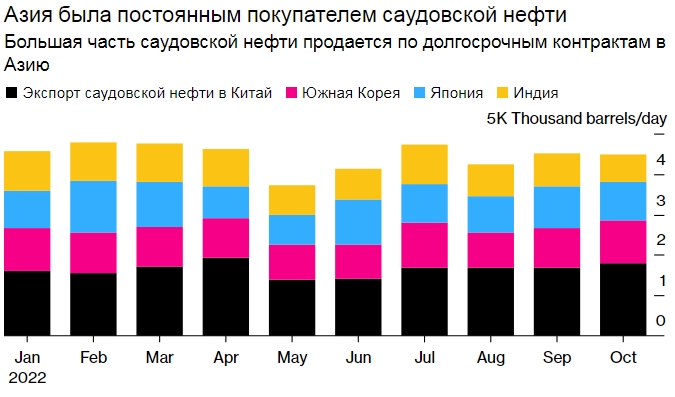 Азия была постоянным покупателем саудовской нефти. Большая часть саудовской нефти продается по долгосрочным контрактам в Азию. Источник: Блумберг.