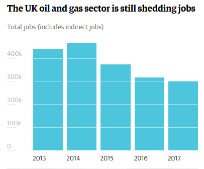 Несмотря на рост цен на нефть, тысячи сотрудников британского сектора в Северном море потеряли работу. Спад цен на нефть в 2014-16 году оставил в промышленности всего 315,000 человек из 500,000. В первой половине 2017 года без работы остались еще 13,000 человек.